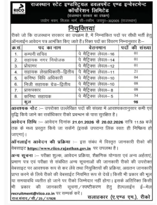 The last date to complete and submit the online application form is 07 March 2026. This article provides complete information about the RIICO Recruitment 2026, covering details such as eligibility criteria, age limit, pay scale, selection procedure, step-by-step application process, and direct links to the official notification and online application form.